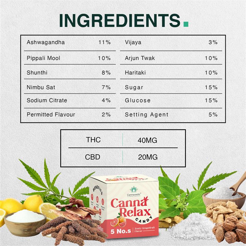 Experience the synergy of science and Ayurveda with CannaRelax Candy, designed to elevate your well-being naturally. Each gummy combines the power of 60mg of Vijaya leaf extract with the soothing effects of ancient herbs, providing a holistic solution for relaxation, stress relief, and improved sleep.